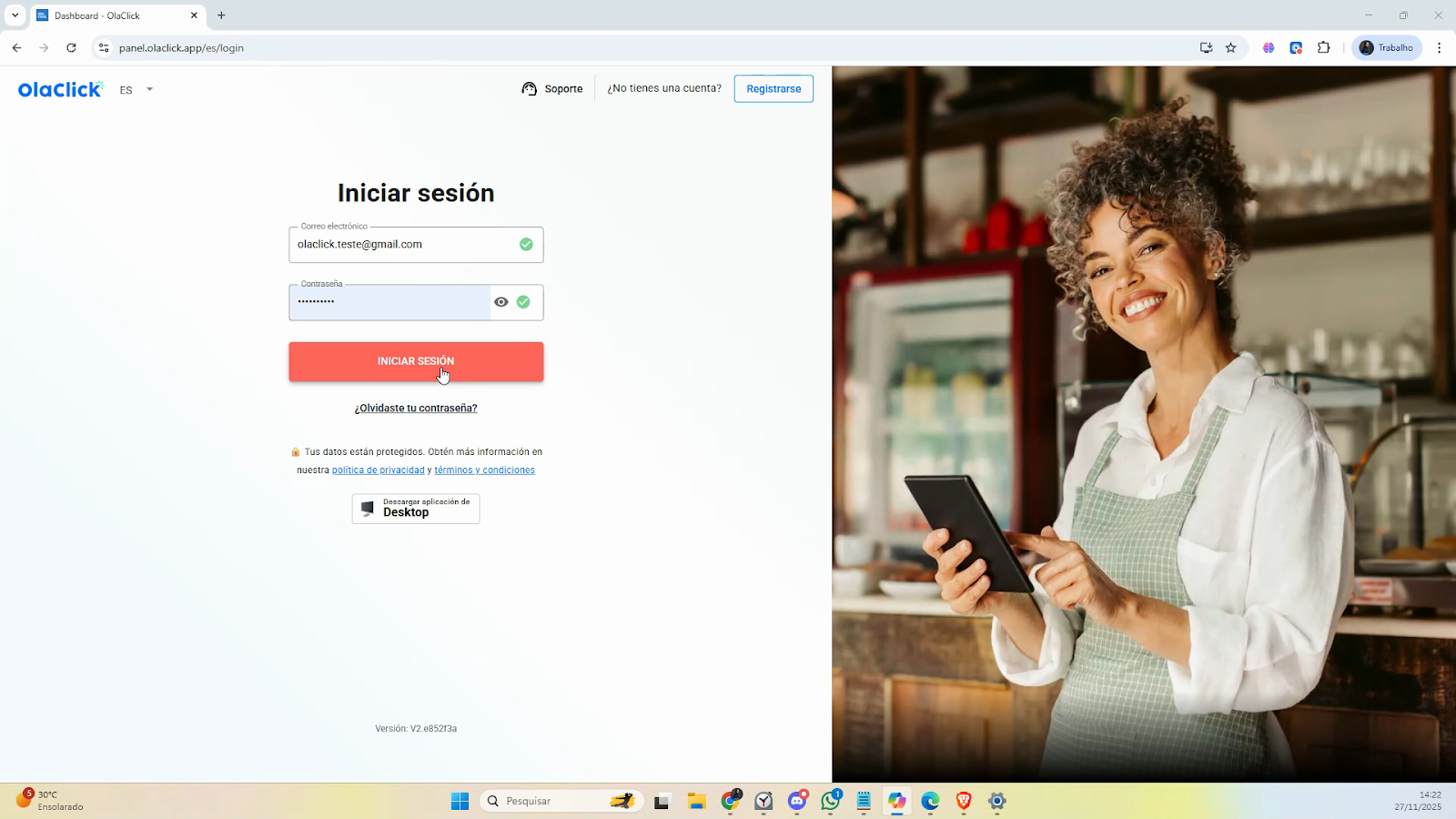 Con tu tienda ya creada, ingresa a nuestro panel, escribiendo el correo electrónico utilizado en el registro de OlaClick y, justo debajo, tu contraseña.