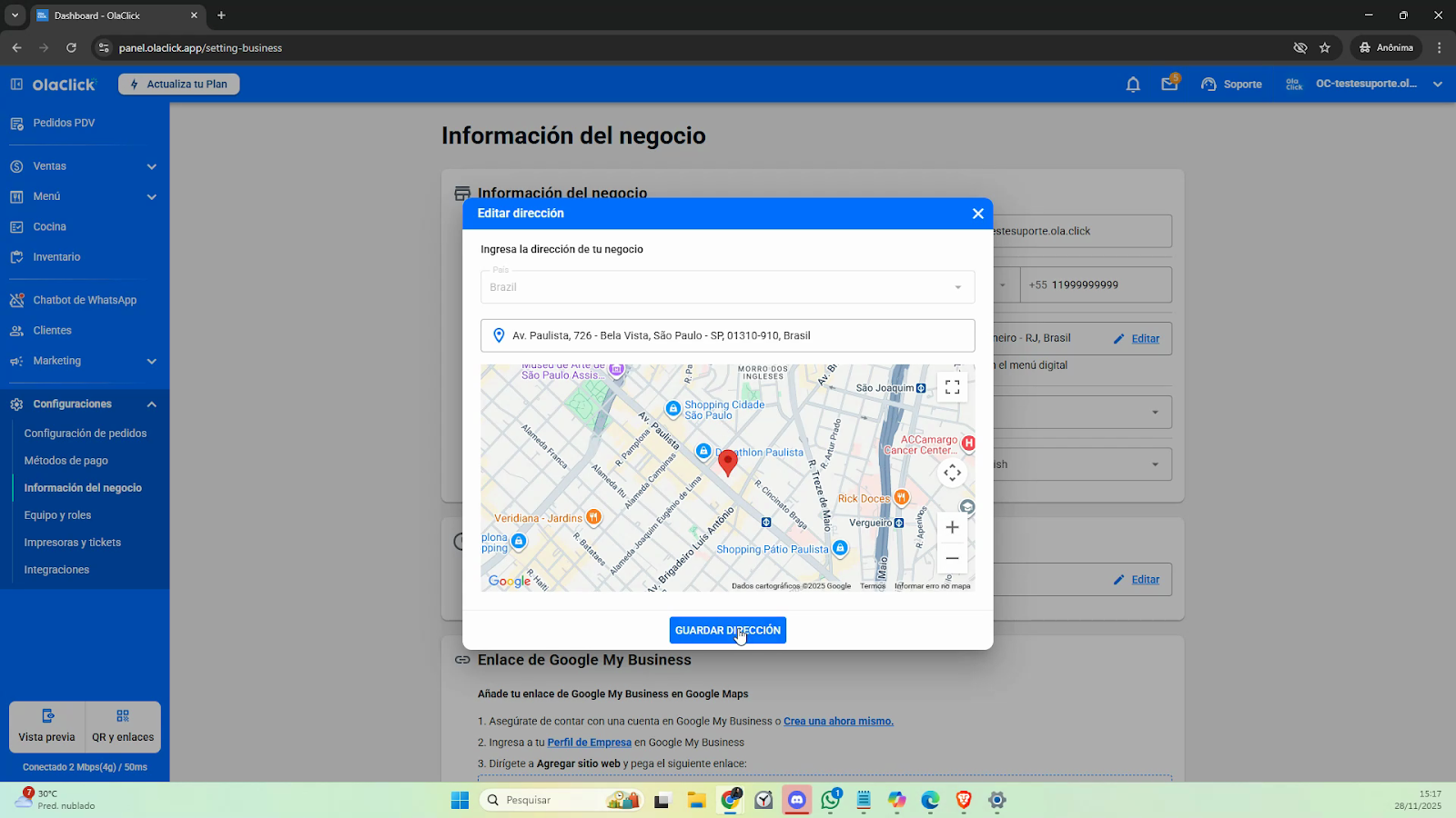 Paso 4: Escribe la dirección de tu establecimiento en el campo que aparece. El sistema realizará una búsqueda inteligente y mostrará un mapa para ayudarte a precisar la ubicación.