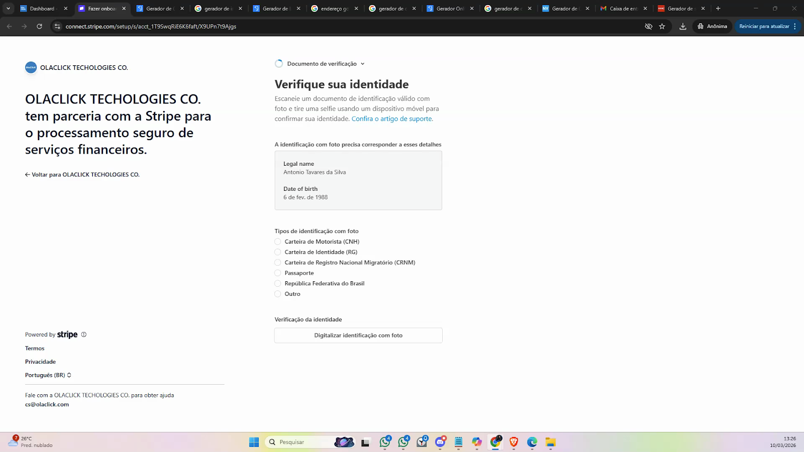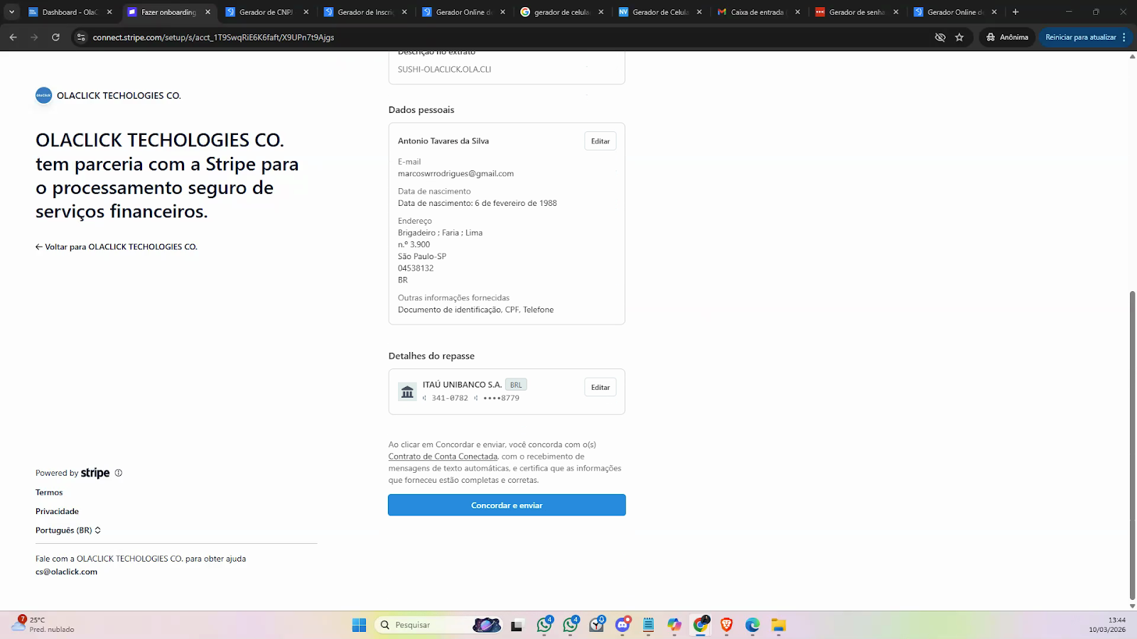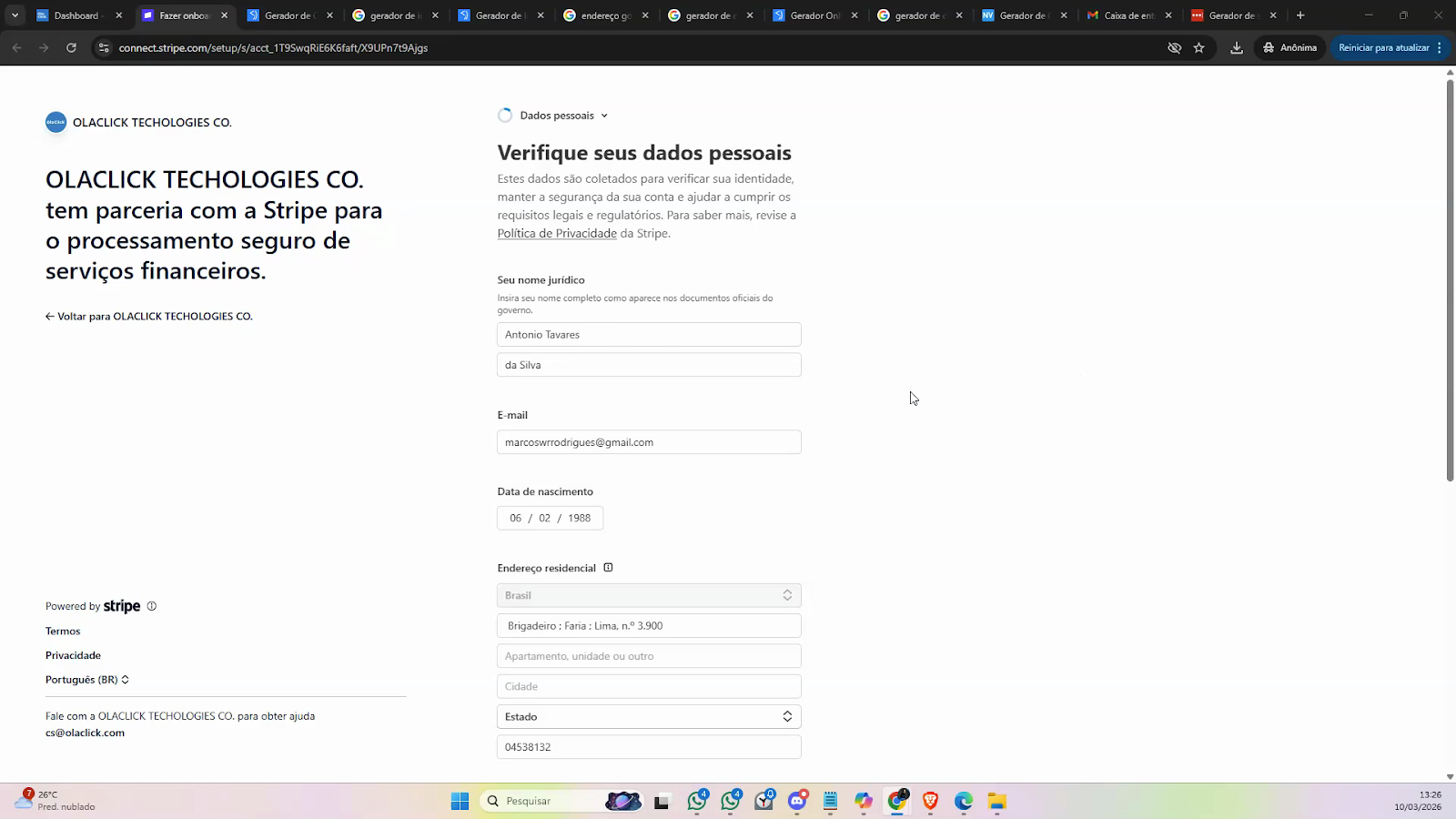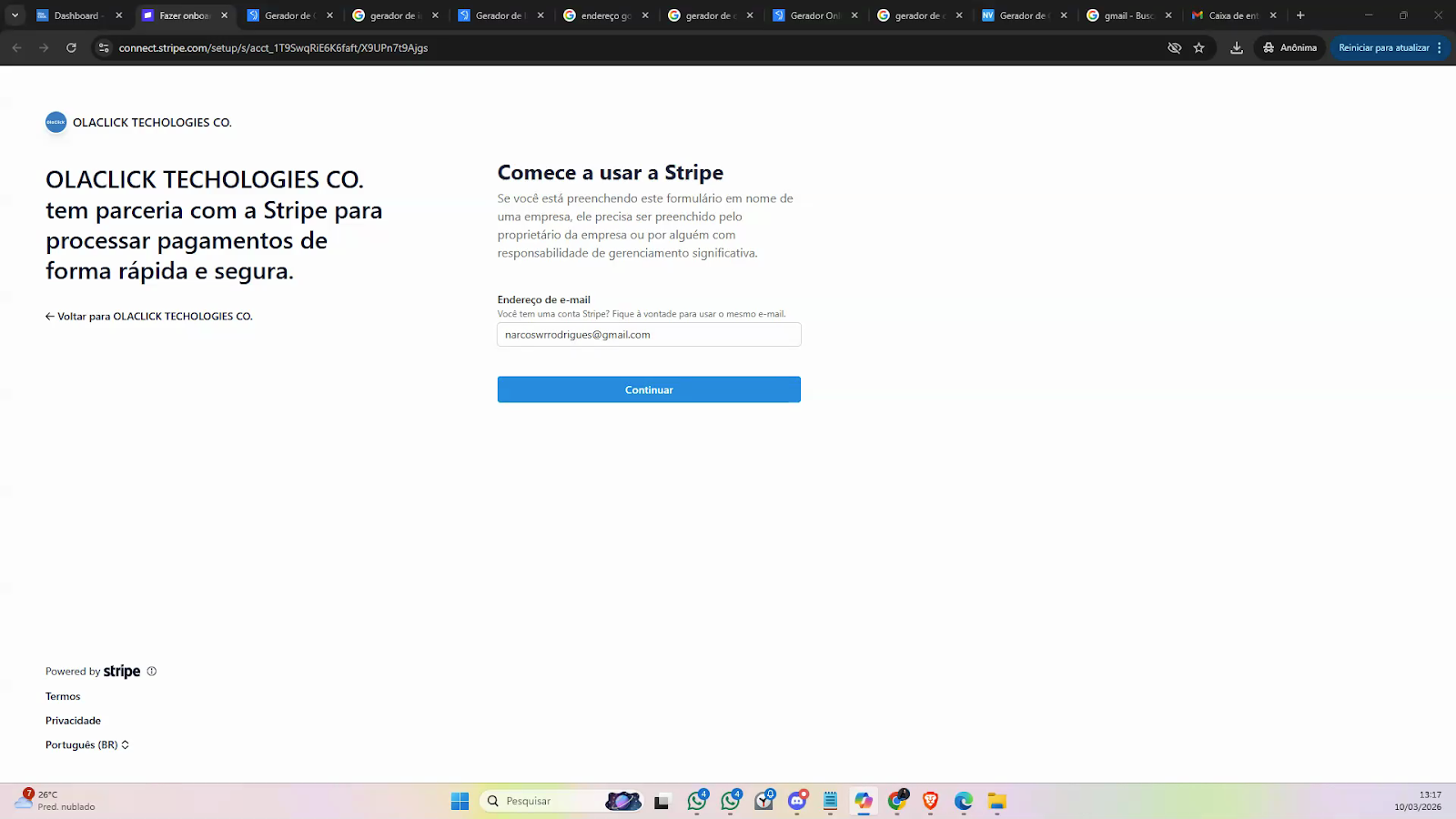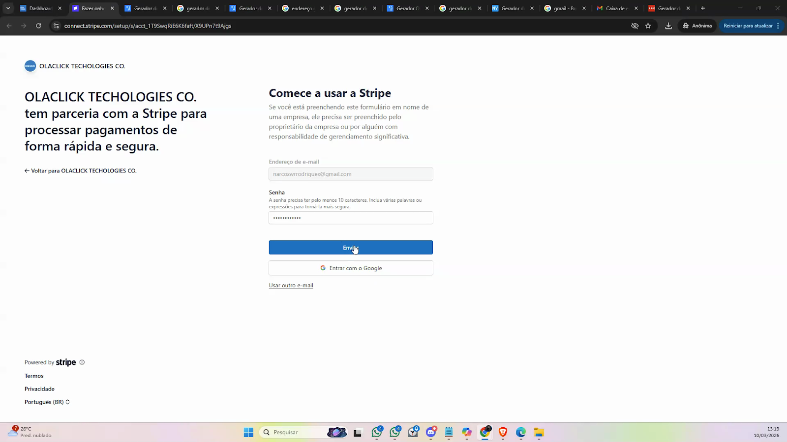 Preencha os dados solicitados na Stripe, começando pelo e-mail e crie uma nova senha.