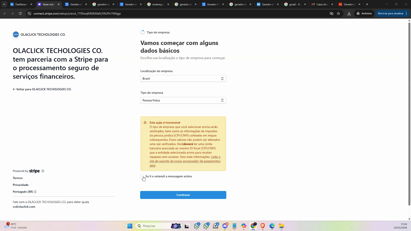 Insira a localização e o tipo da empresa. Marque a opção confirmando que leu e entendeu a mensagem, depois clique em Continuar.