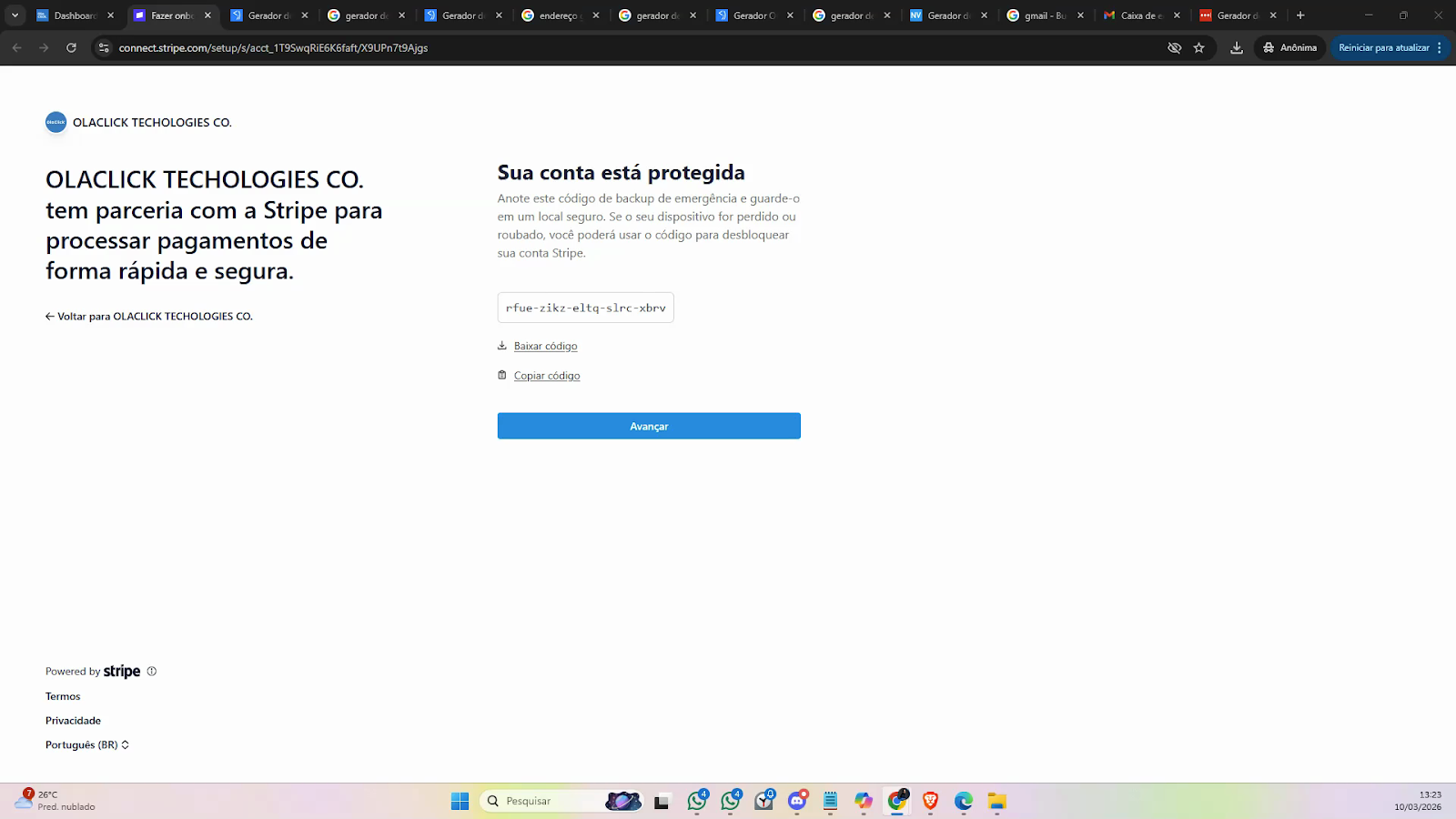 Anote o código de backup de emergência. Ele será necessário caso você perca o acesso ao dispositivo de autenticação.