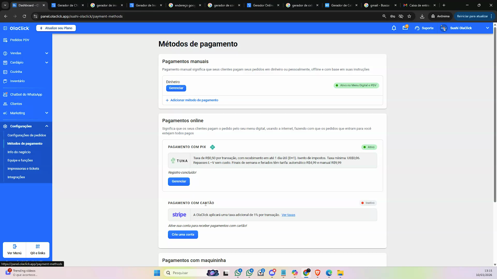 Em Pagamento online, localize a opção da Stripe e clique em Crie uma conta.