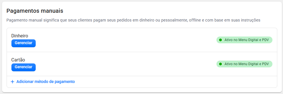 Os pagamentos manuais permitem que seus clientes realizem o pagamento fora da plataforma, seguindo as instruções que você definir.
